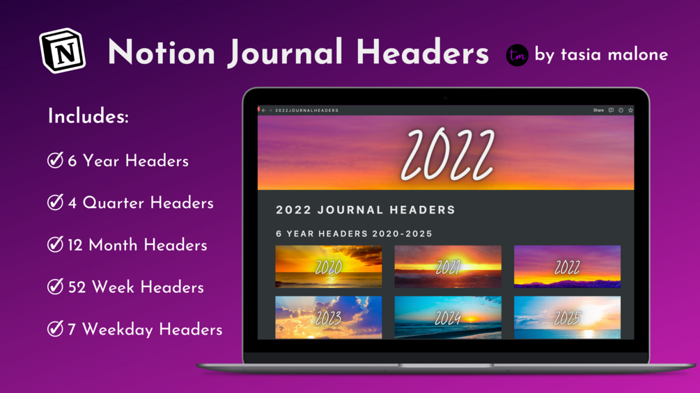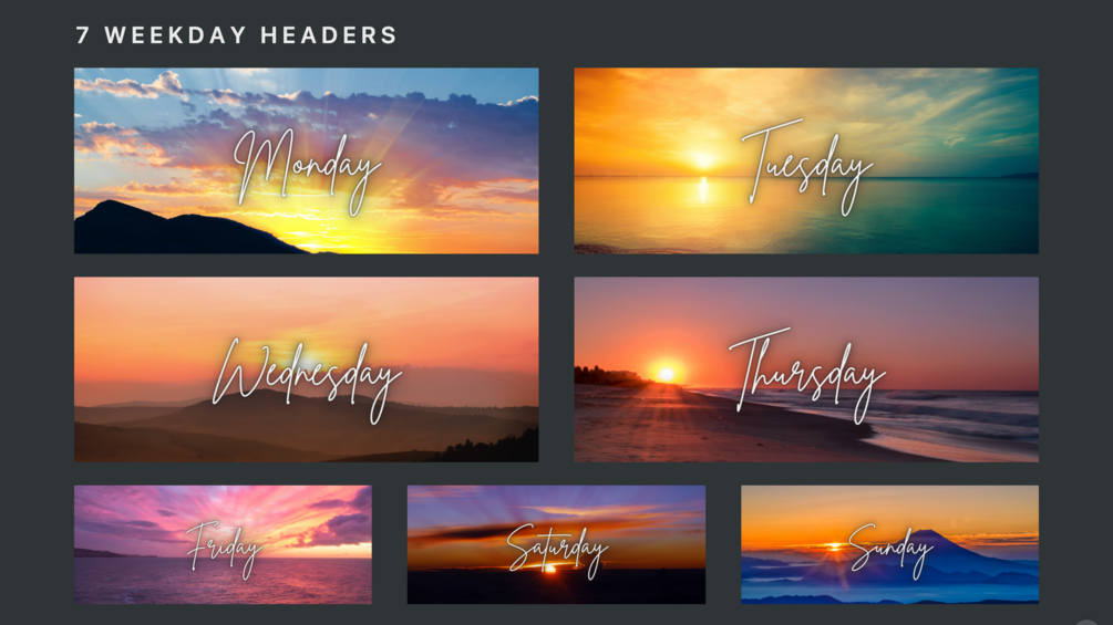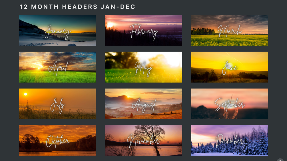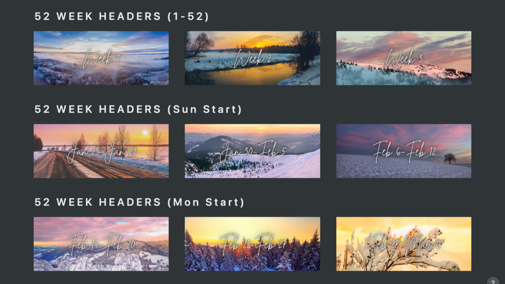 This set includes journal headers optimized for Notion cover images. This a different sunrise horizon scene for each cover image, including different headers for the year, quarter, month, weeks, and weekdays. That's over 75 different cover images!