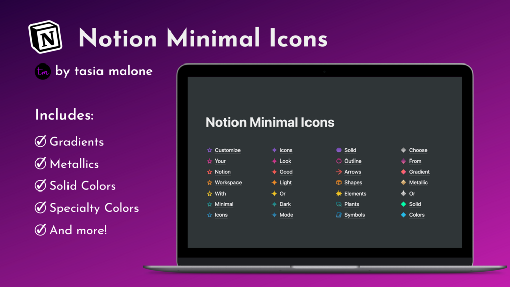This set contains 3000+ icons in a variety of styles, including gradients, neons, metallics, and solid color sets outside of the colors from the original Minimal Icons (link included on the Notion duplication page). The set also includes a "solid" version for icons where it made sense. The included icons are zipped PNG files with transparent backgrounds at 280x280 px.